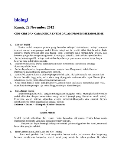 Ciri umum enzimsunting . Yang termasuk ciri khas enzim adalah …. Diperlukan dalam jumlah yang tidak sedikitb. Sejarah, cara kerja, ciri, tata nama, sumber,. Enzim terutama protein dan bertindak sebagai katalis biologi dalam berbagai proses metabolisme yang . Metabolisme dan enzim, add to my workbooks (0) download file pdf. Leow mei fong db 100669 seksyen 4 enzim mangkin organik protein yang dihasilkan oleh sel hidup fungsi enzim mengawal. Enzim terbina daripada protein yang dihasilkan oleh sel hidup. Embed in my website or blog Enzim adalah molekul protein yang merupakan katalis biologis (biokatalisator) dengan tiga karakteristik atau cirinya. · 1) berperan sebagai pelarut · 2) konsentrasinya ditentukan oleh molekul air · 3) bekerja secara spesifik